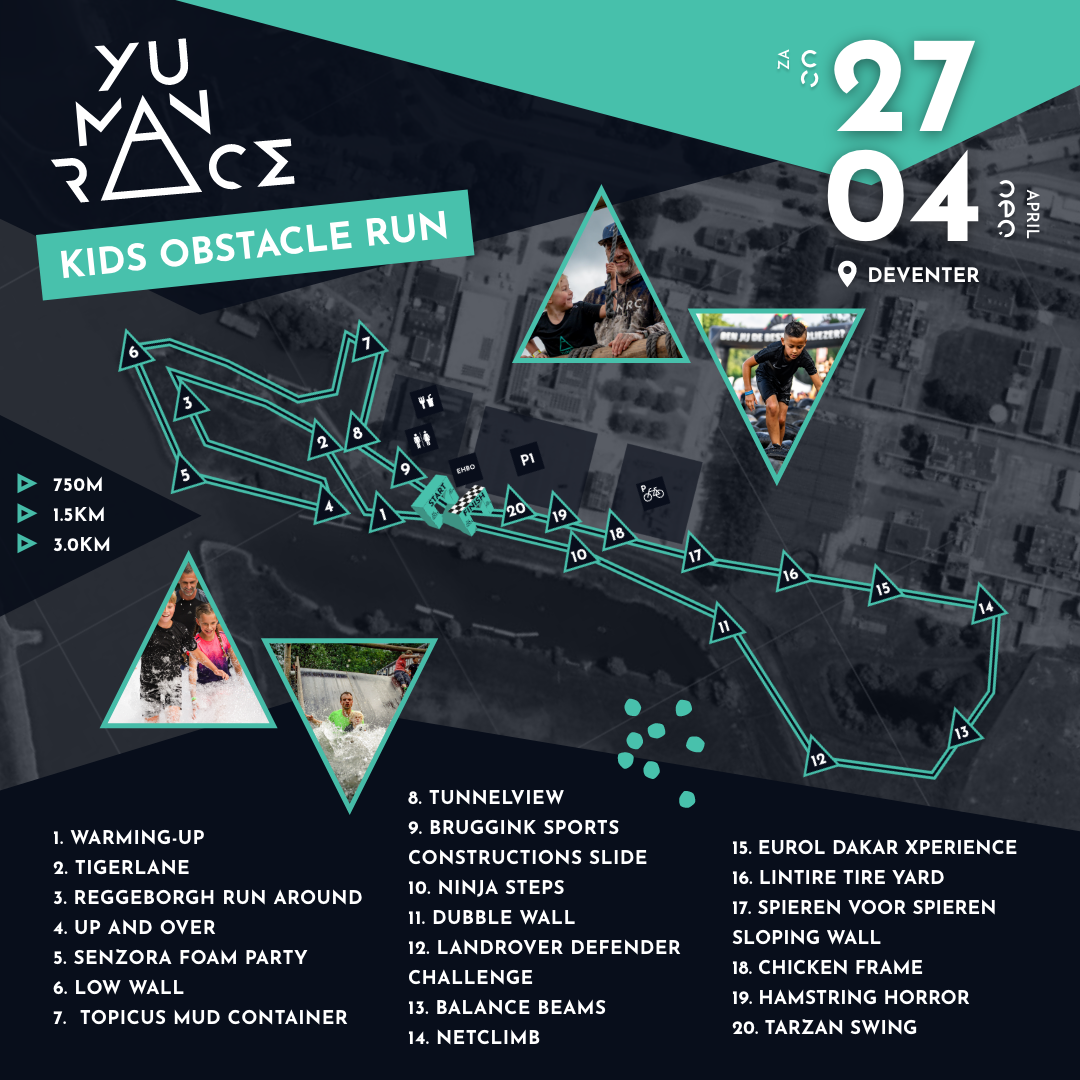 De KIDS OBSTACLE RUN Enschede bestaat uit een 750M, 1.5KM en een 3KM parcours op het Rutbeek vol met uitdagende en moddervette obstakels. Het parcours is gericht op allerlei leuke fun obstakels. Hieronder het parcours van de KIDS OBSTACLE RUN Deventer. Over enkele weken maken we het parcours voor Enschede bekend. Volg ons op Facebook en Instagram om op de hoogte te blijven van alle ontwikkelingen over de YU MAN RACE KIDS OBSTACLE RUN Enschede.