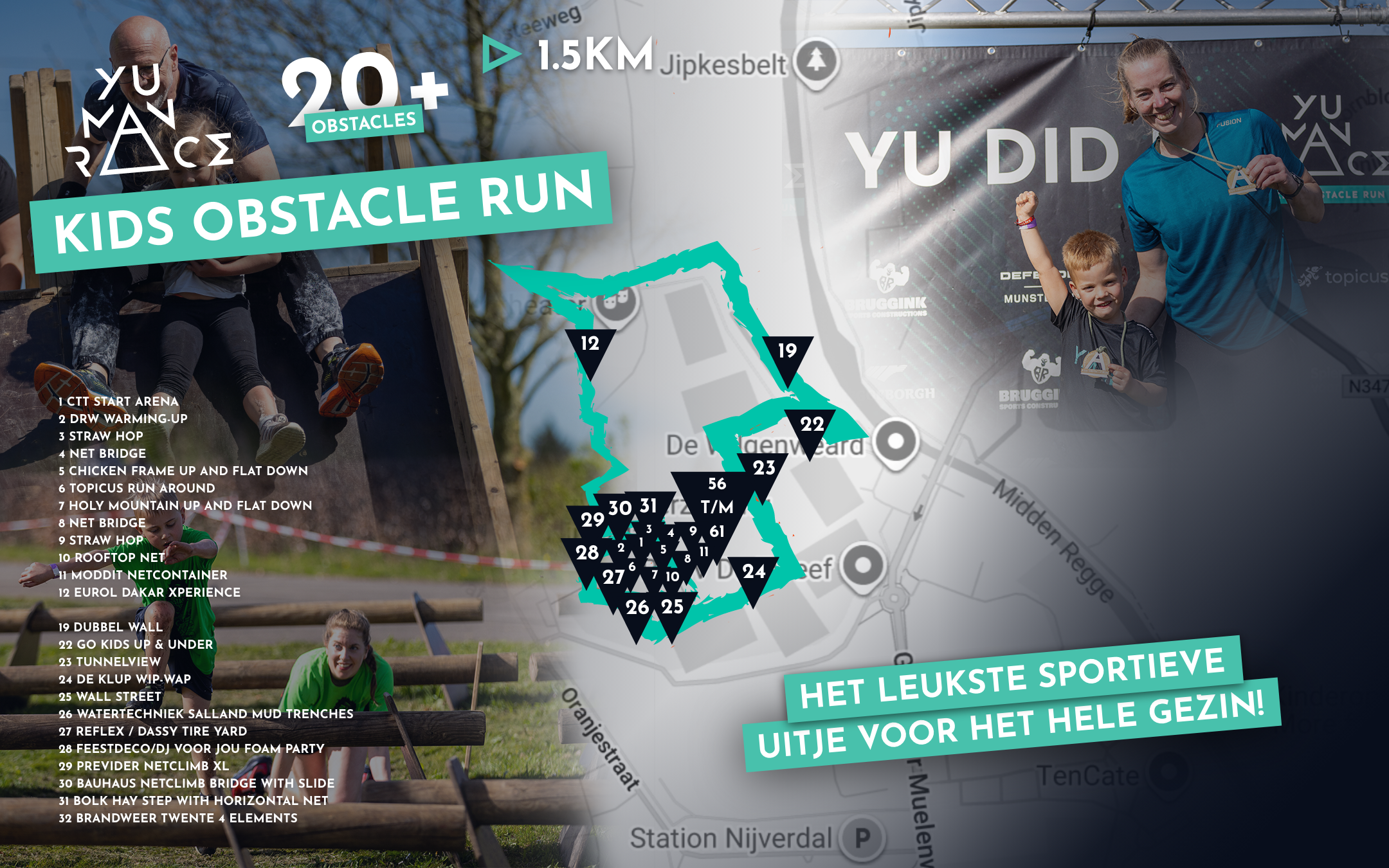 Op zaterdag 05 september 2026 klinkt het startschot van de YU MAN RACE KIDS OBSTACLE RUN! Dit moddervette event vol uitdagende obstakels vindt plaats in Nijverdal (Gemeente Hellendoorn) en staat garant voor veel modder en FUN. De KIDS OBSTACLE RUN wordt gehouden in twee verschillende afstanden: 1.5KM en 3KM. Na een gezamenlijke warming-up begint de race vol toffe obstakels en grote modderbaden. De run staat in het teken van plezier hebben, samen met vriendjes en vriendinnetjes, ouders en/of begeleiders. Een groot feest voor ieder kind dat avontuurlijk ingesteld is! Ben je sportief, niet bang om vies te worden en een echte doorzetter? Dan is deze run echt iets voor jou! We hopen je op 05 september 2026 aan de start te zien!