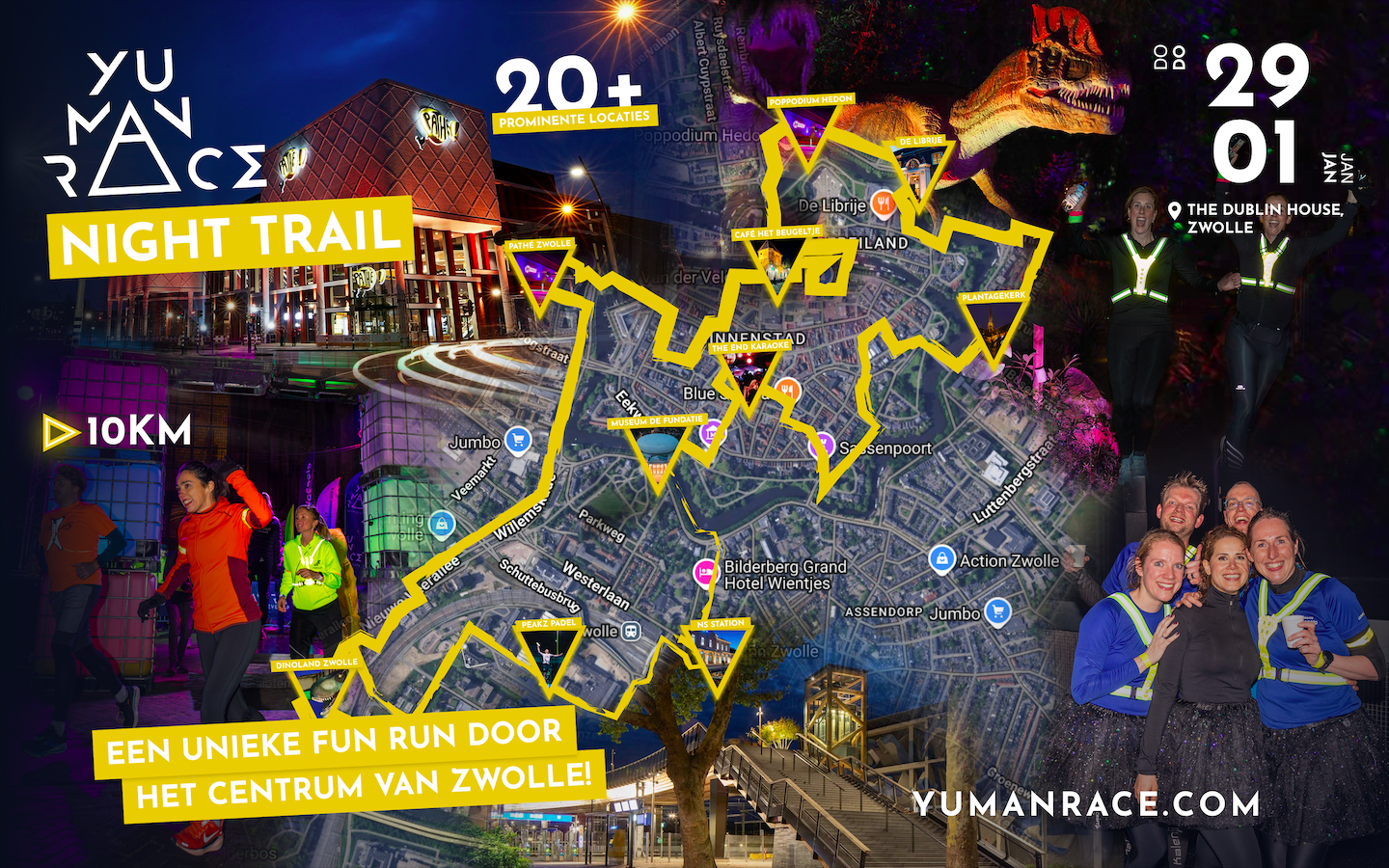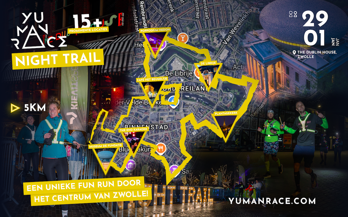 Op donderdagavond 29 januari 2026 organiseren wij in het centrum van Zwolle de allereerste editie van een uniek hardloopevent: de NIGHT TRAIL! De NIGHT TRAIL Zwolle is een fun run die start en finish in het centrum van Zwolle. Het parcours gaat langs prominente plekken en gebouwen in Zwolle. Deze plekken en gebouwen zullen worden verlicht. We starten en finishen voor het Dublin House. Wij zorgen weer voor een leuke afterparty na de run op het Bethlehemkerkplein! Hoe tof is dat?! De NIGHT TRAIL is er in twee verschillende afstanden. De 5KM en 10KM en geschikt voor zowel de getrainde als de beginnende loper. Loop 5KM of 10KM in het donker en geniet van het unieke spektakel in de verlichte binnenstad van Zwolle. It’s up to YU!!